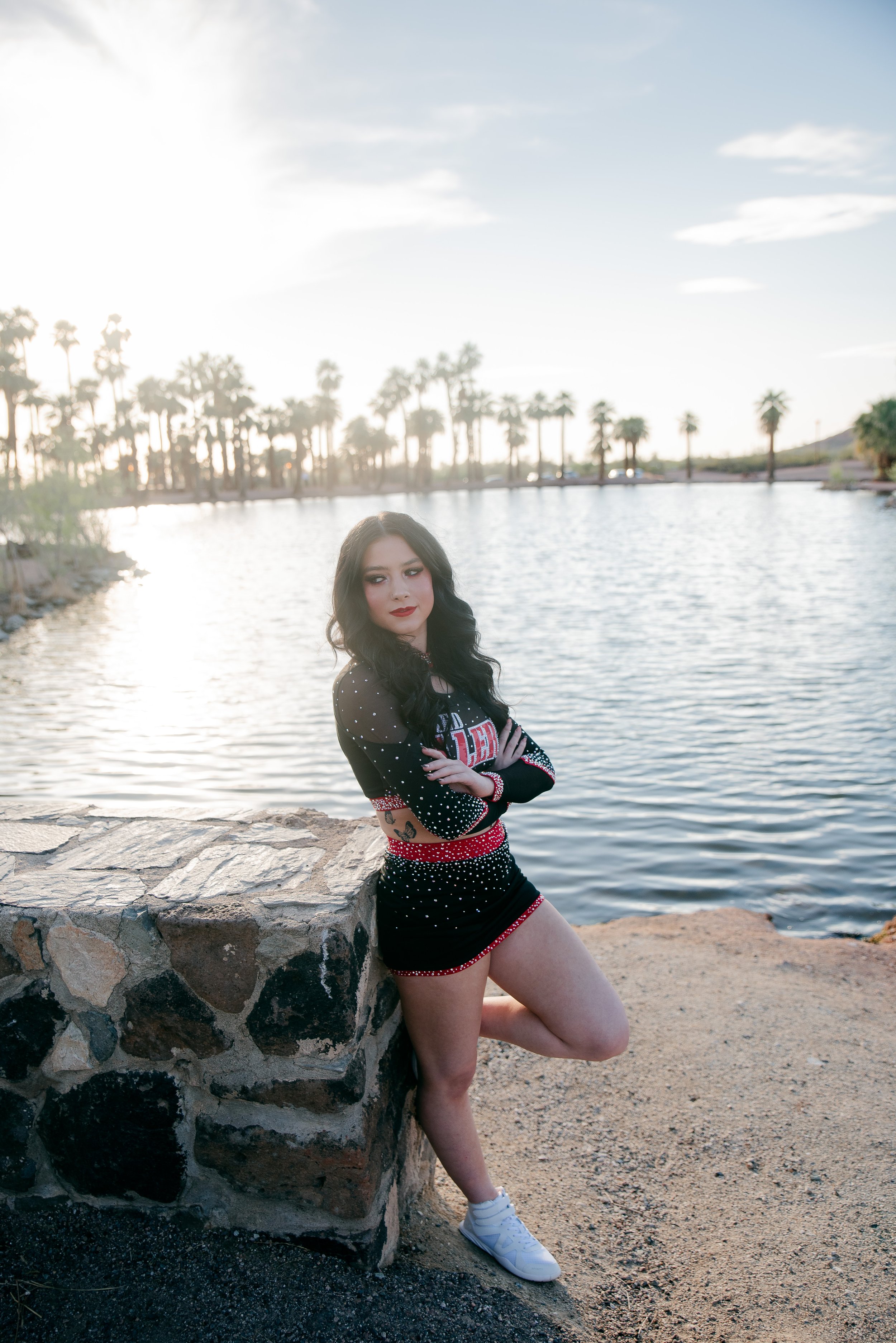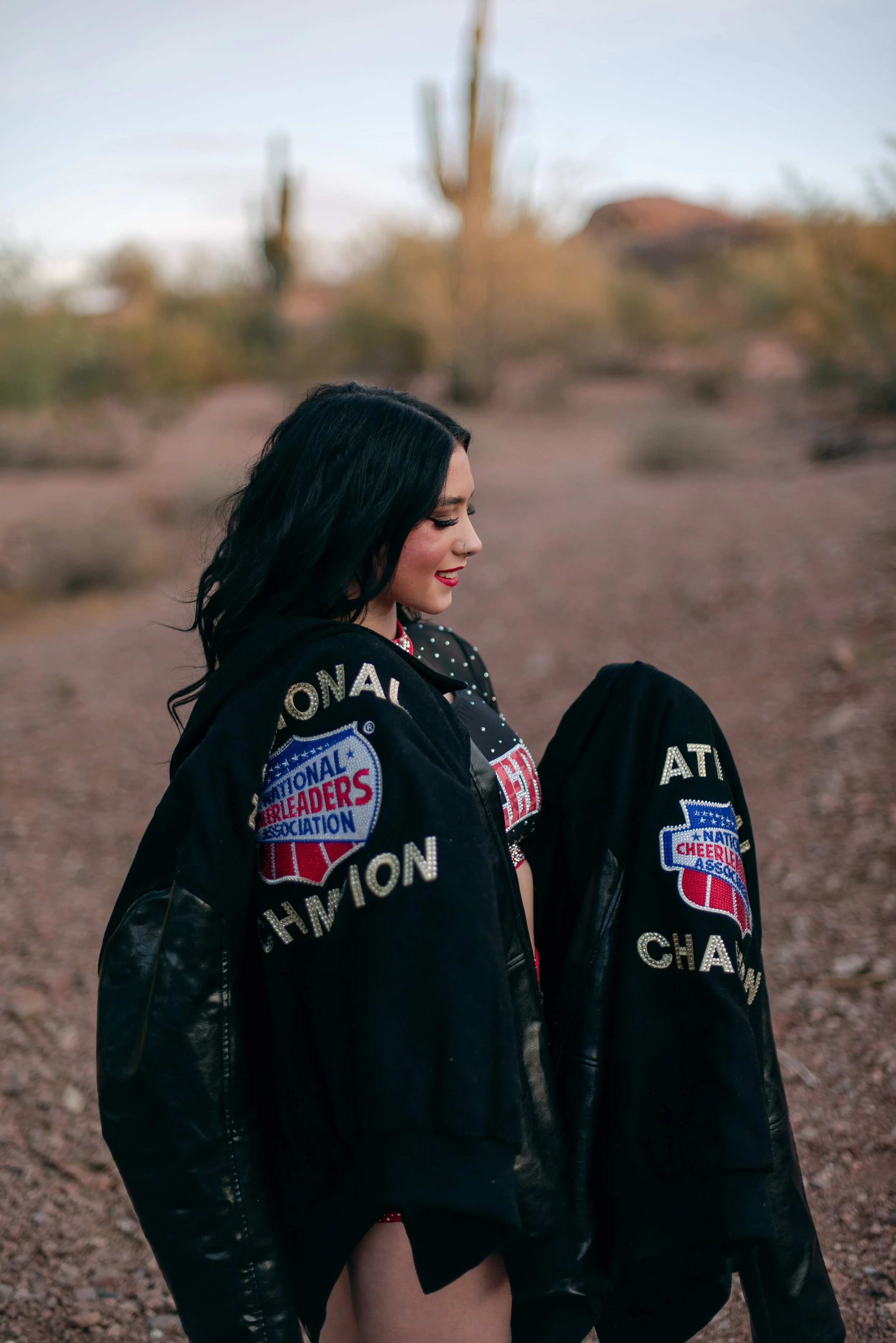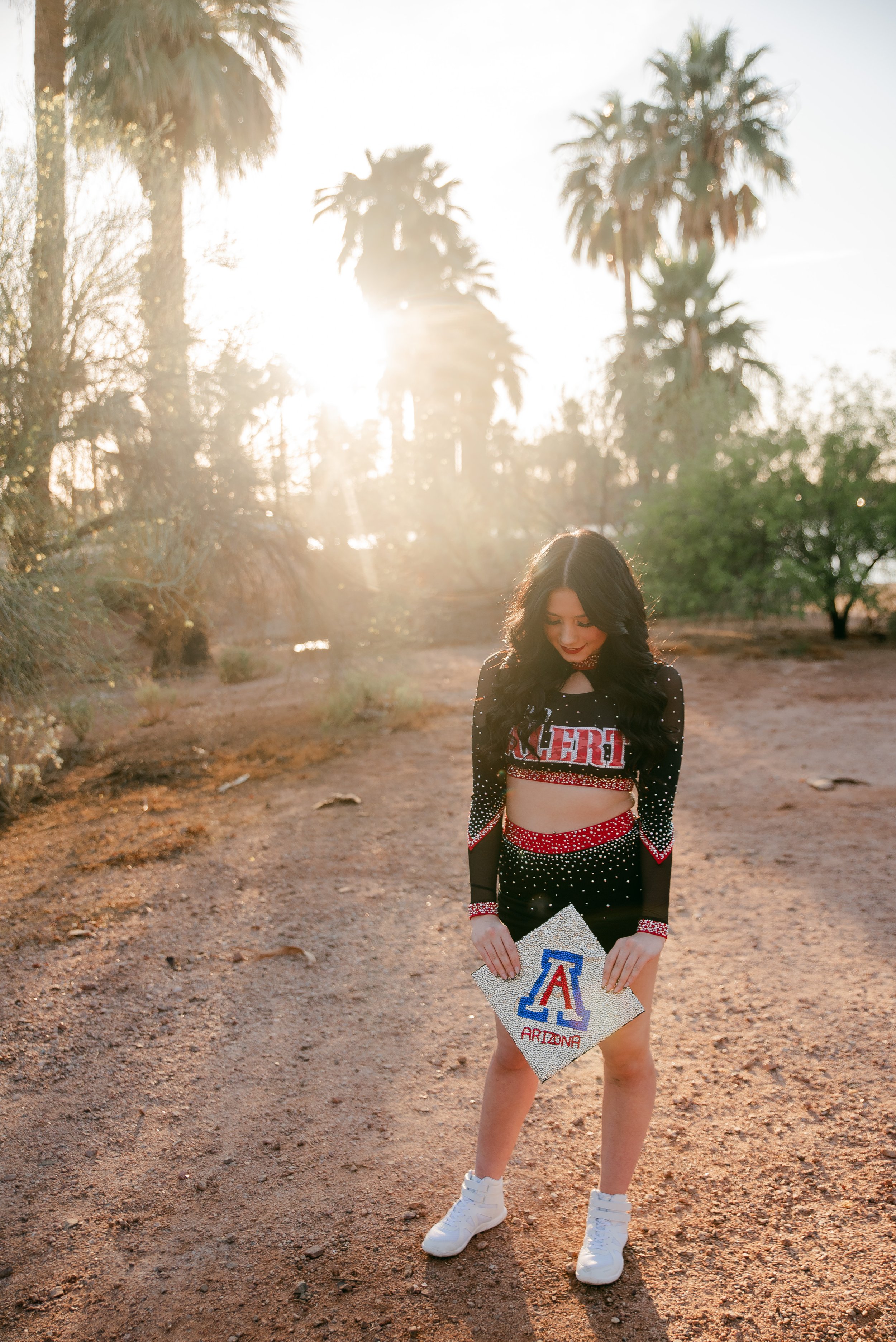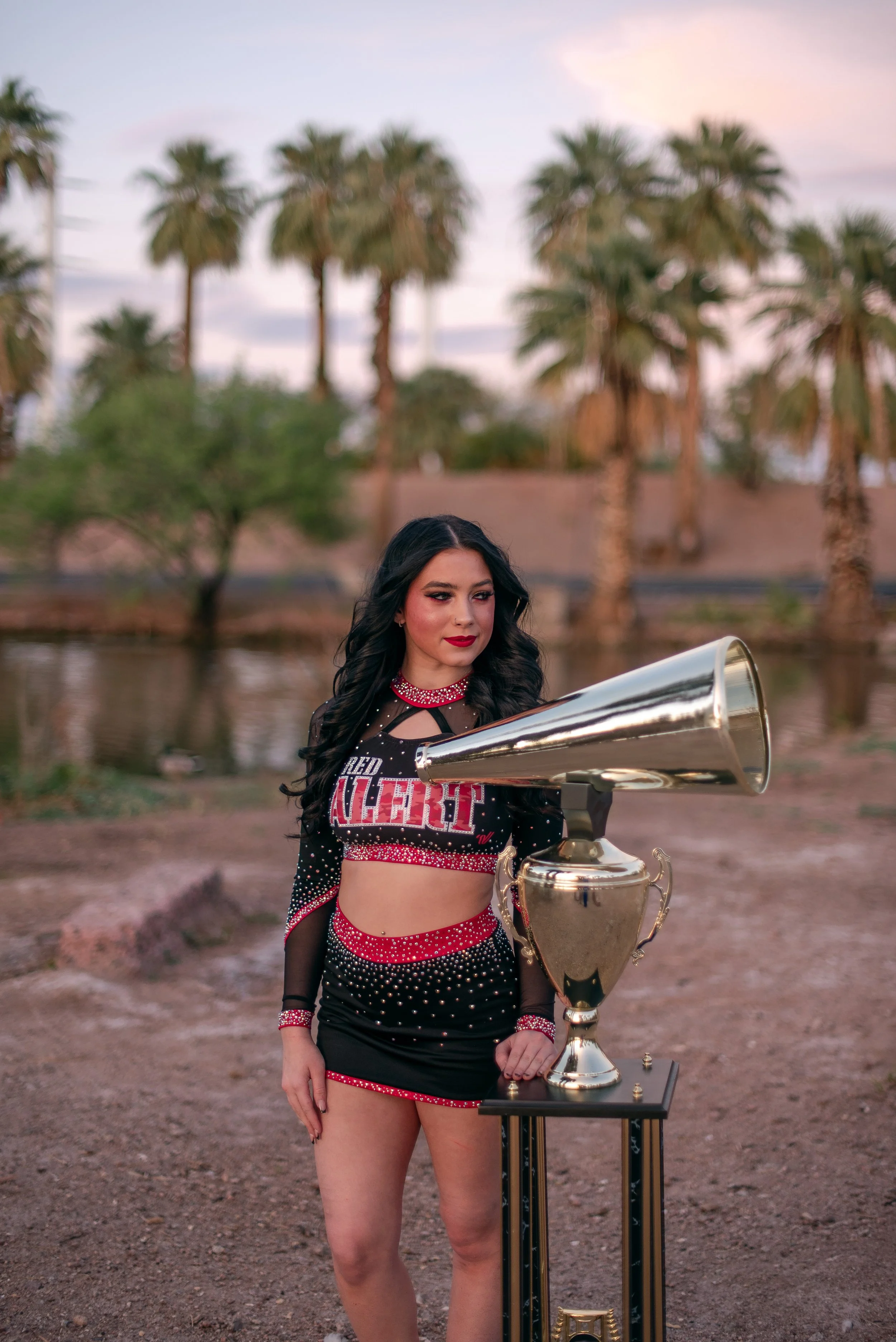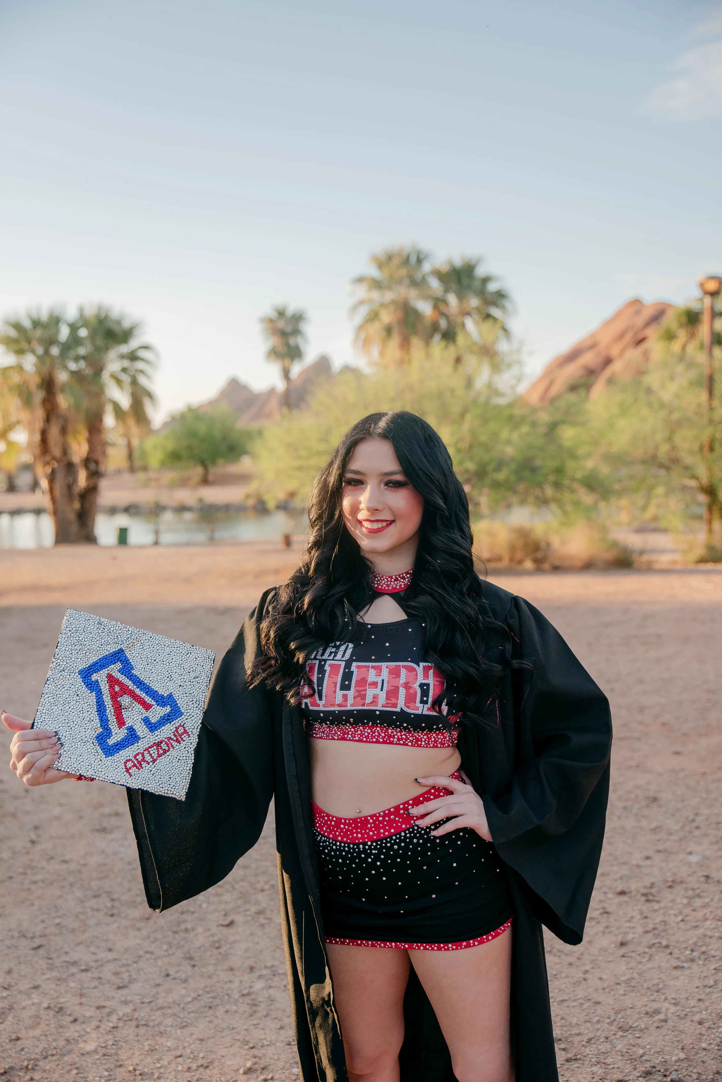 We got to be creative out at Papago Park, which is one of my favorite locations because you can get a mix of desert, water, and greenery. I’m obsessed with the red Woodlands Elite Red Alert uniform against all the desert tones, and her makeup was just perfect. Do not even get me started on all her champion rings, two NCA jackets, and literal NCA trophy.