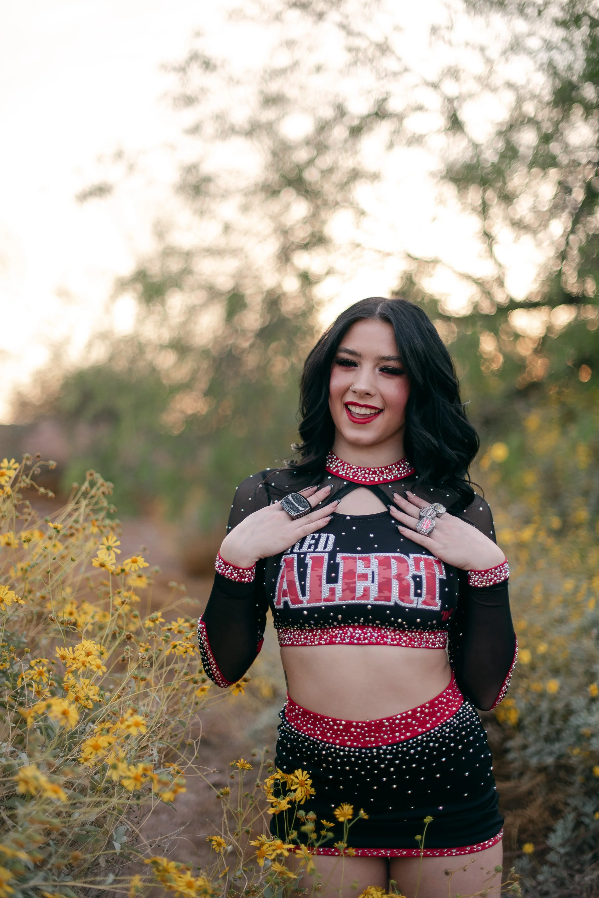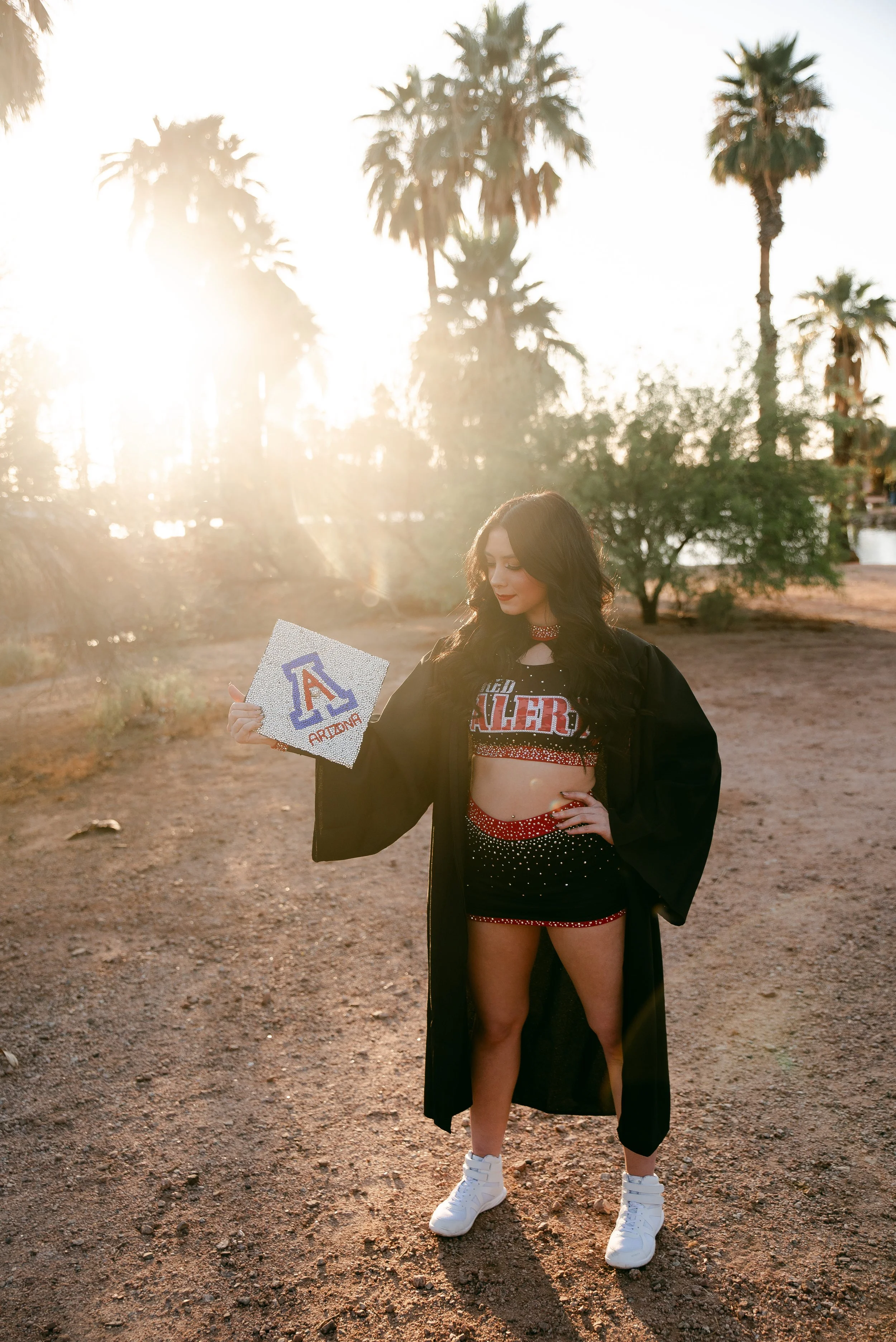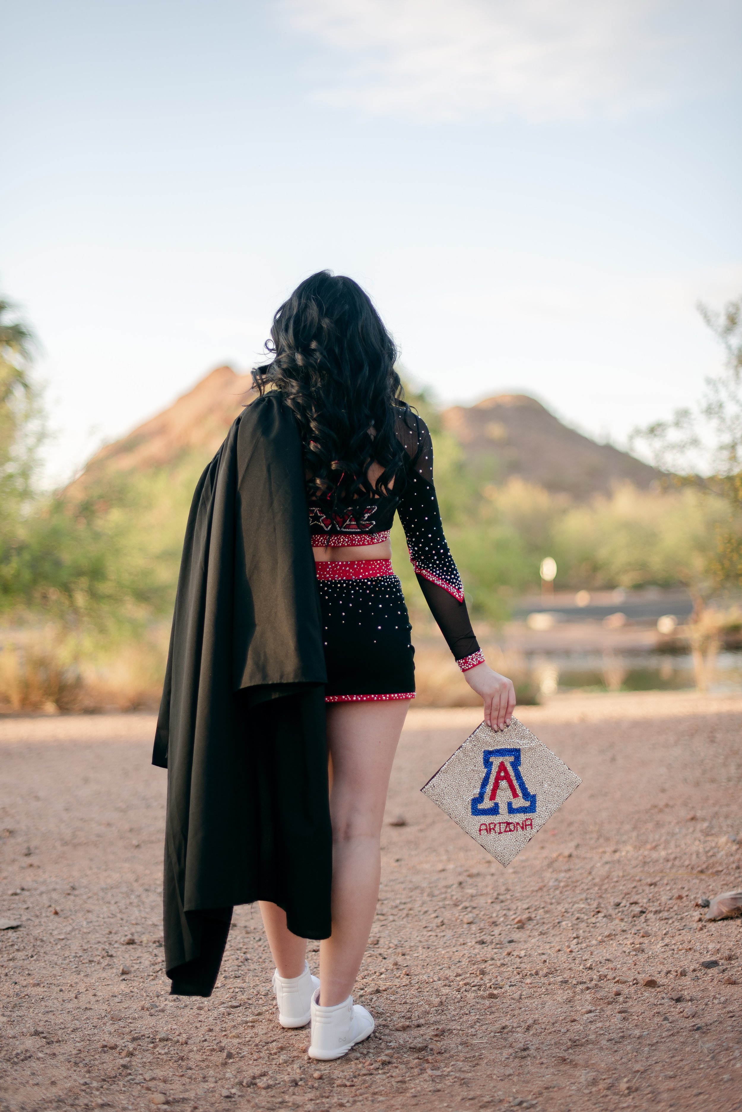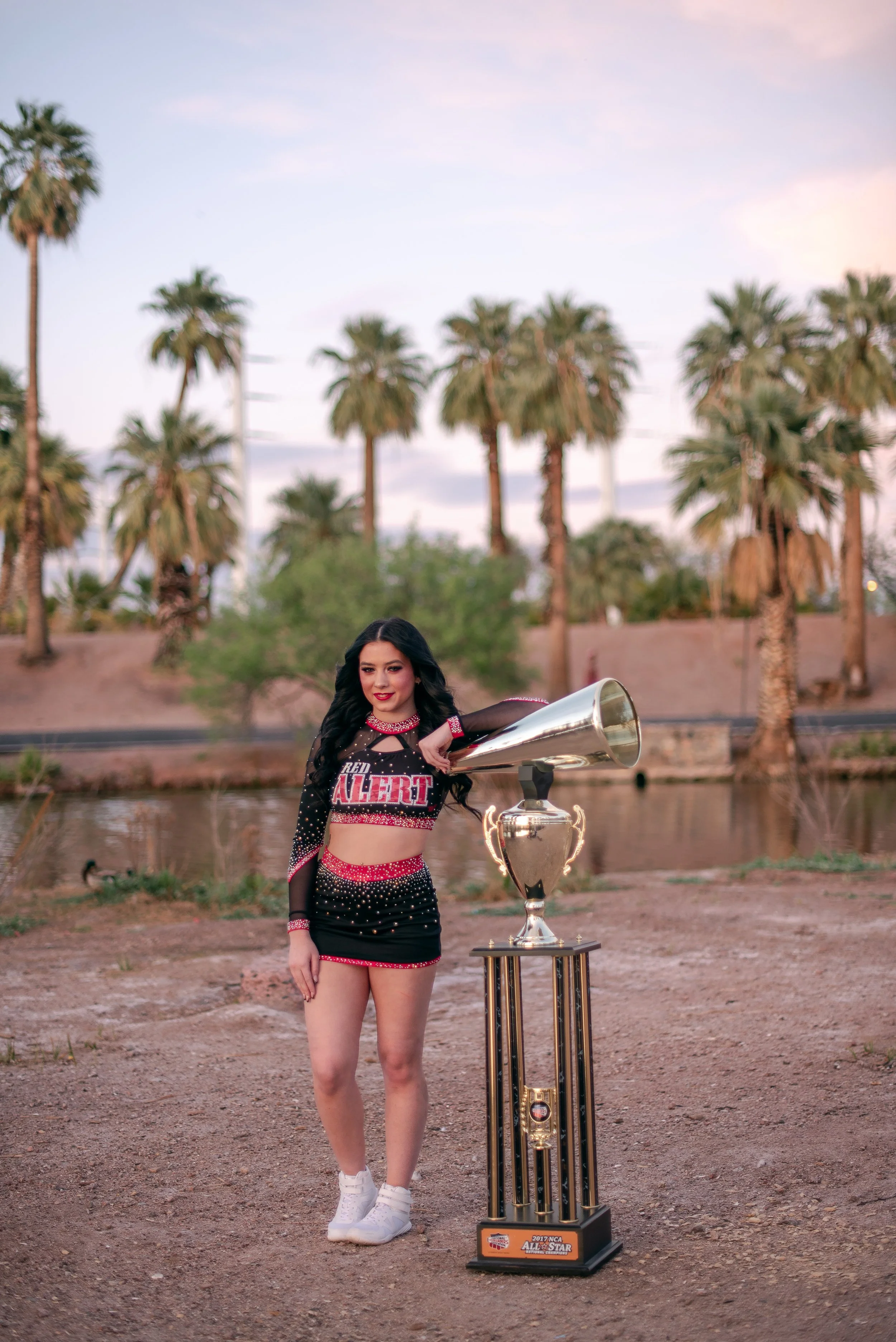 We got to be creative out at Papago Park, which is one of my favorite locations because you can get a mix of desert, water, and greenery. I’m obsessed with the red Woodlands Elite Red Alert uniform against all the desert tones, and her makeup was just perfect. Do not even get me started on all her champion rings, two NCA jackets, and literal NCA trophy.
