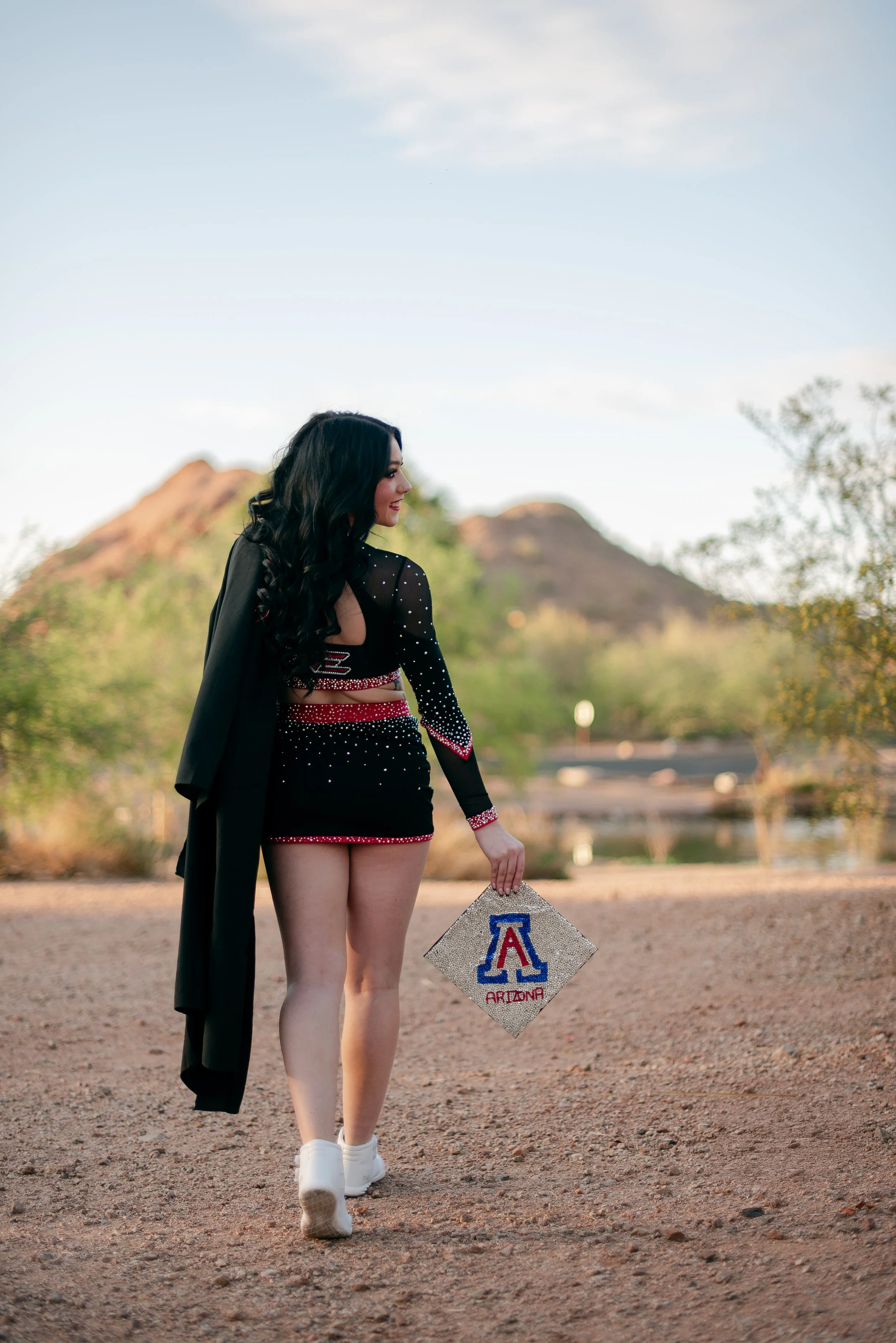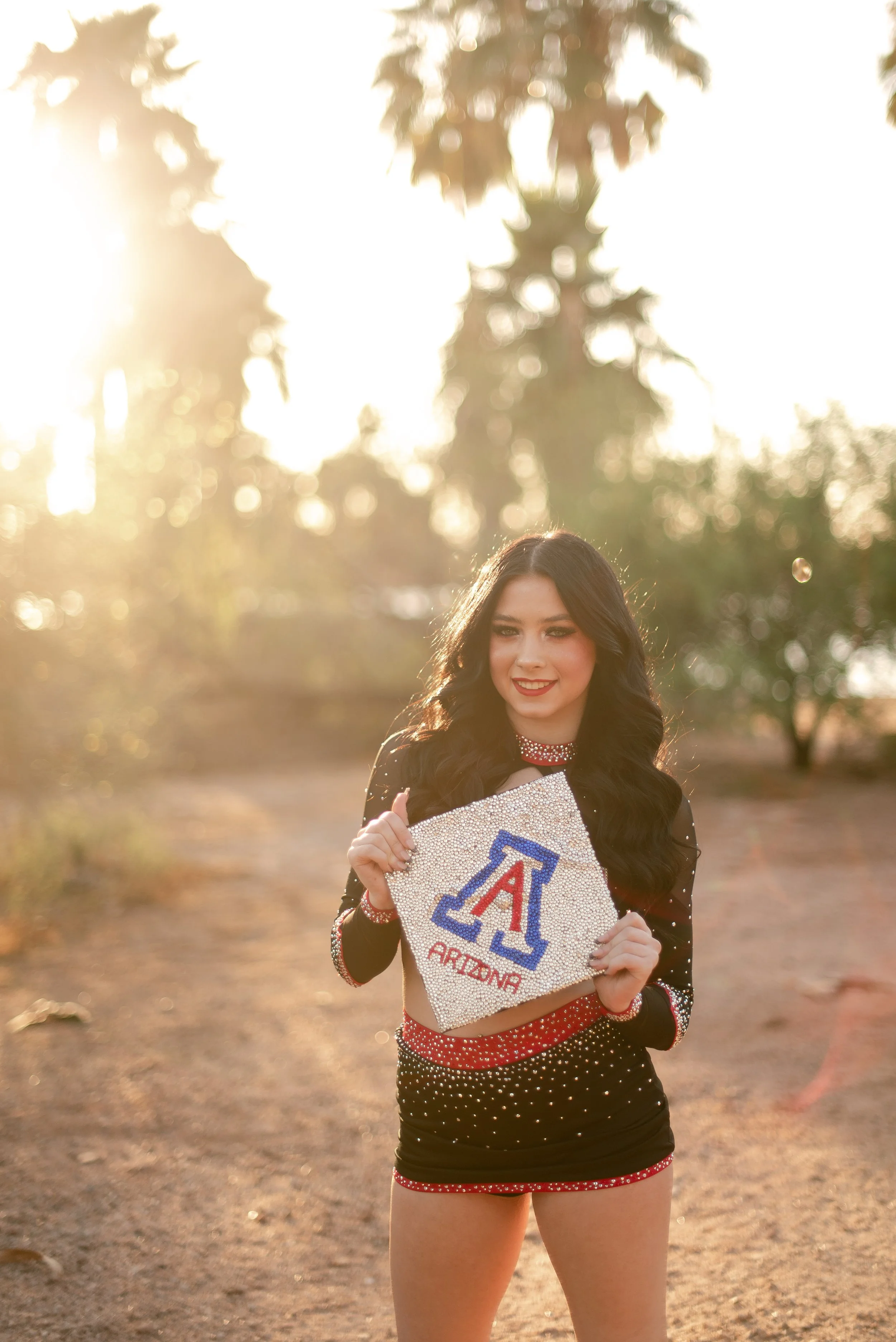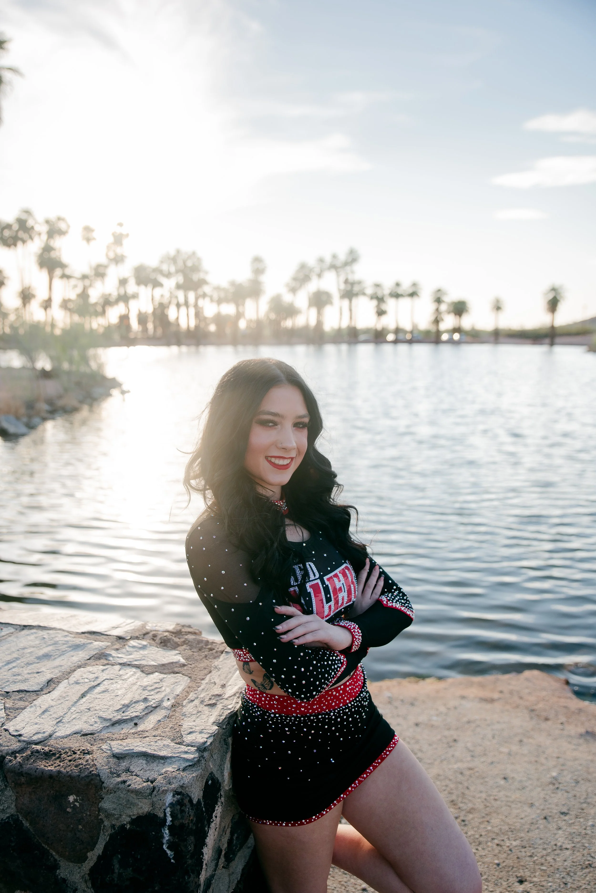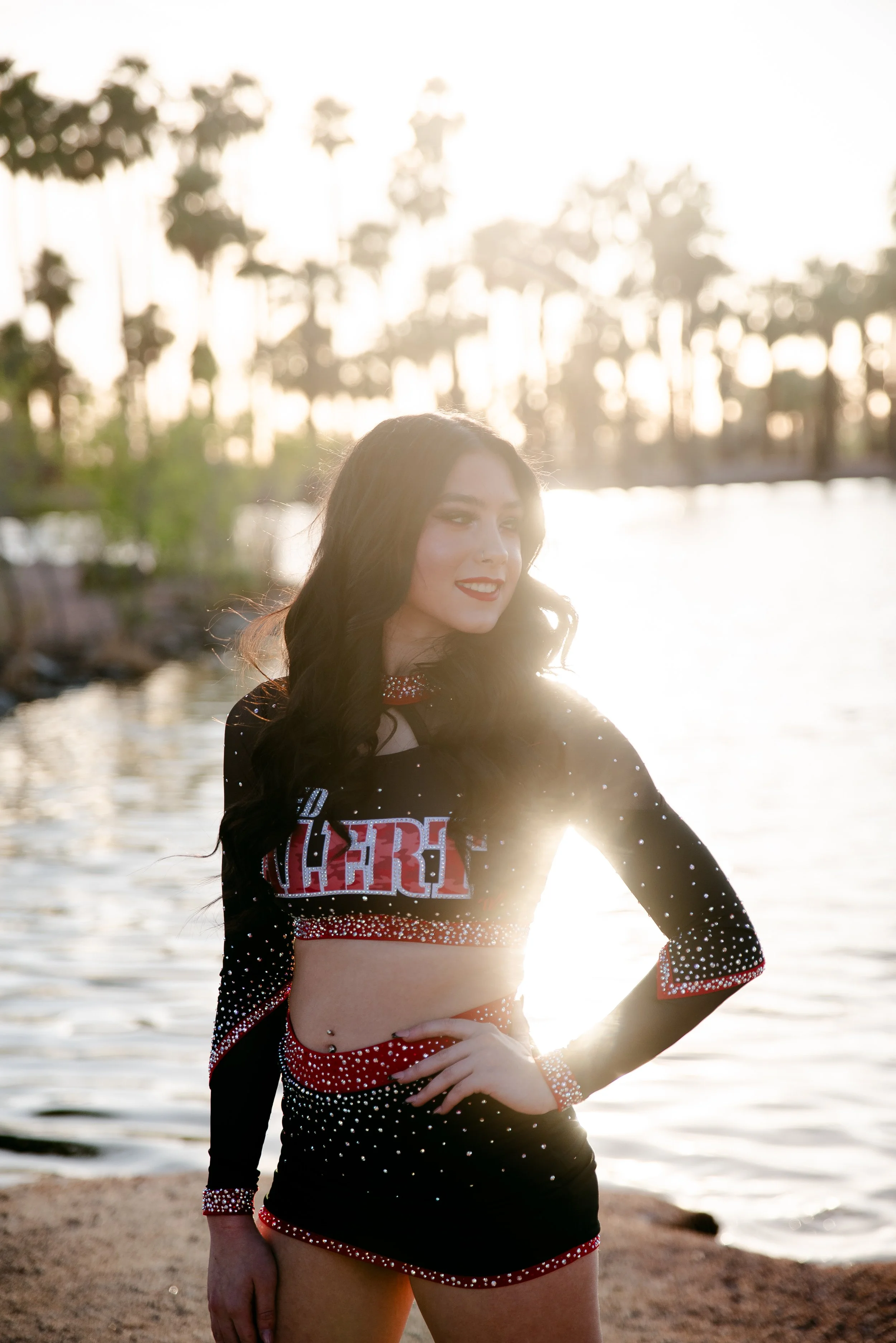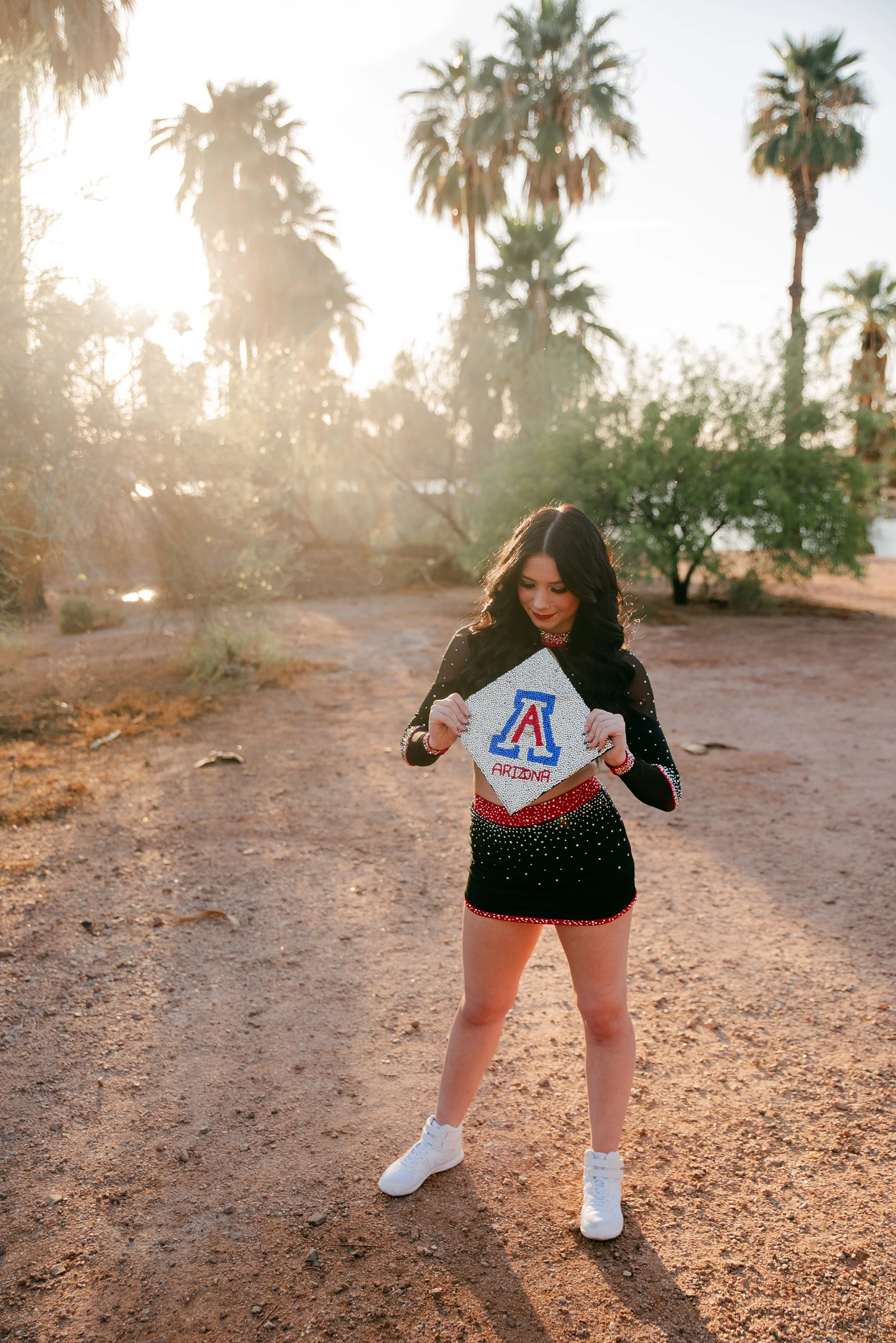 We got to be creative out at Papago Park, which is one of my favorite locations because you can get a mix of desert, water, and greenery. I’m obsessed with the red Woodlands Elite Red Alert uniform against all the desert tones, and her makeup was just perfect. Do not even get me started on all her champion rings, two NCA jackets, and literal NCA trophy.