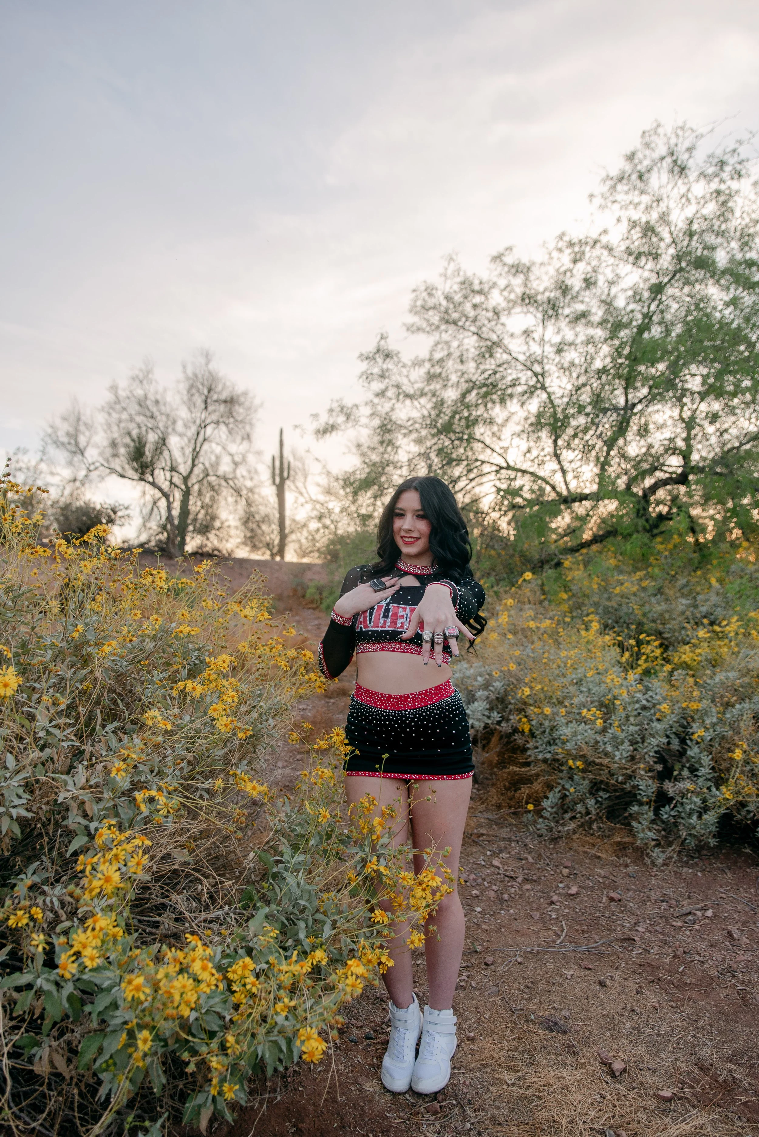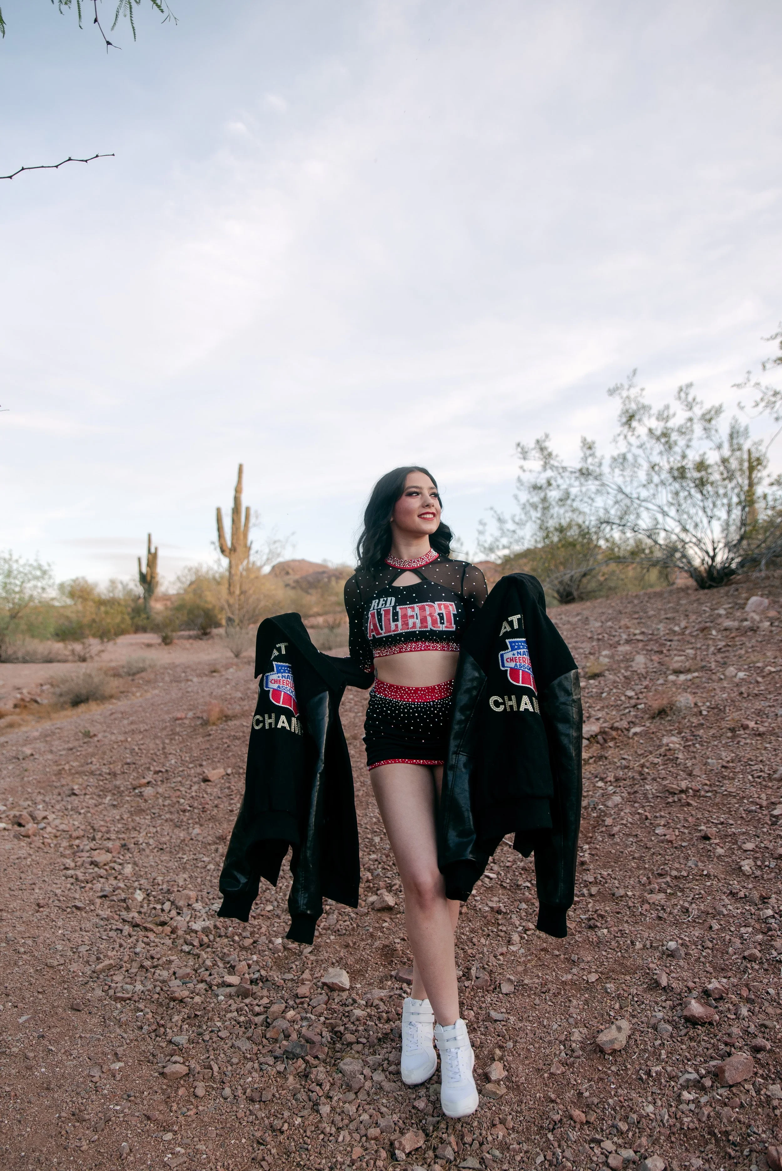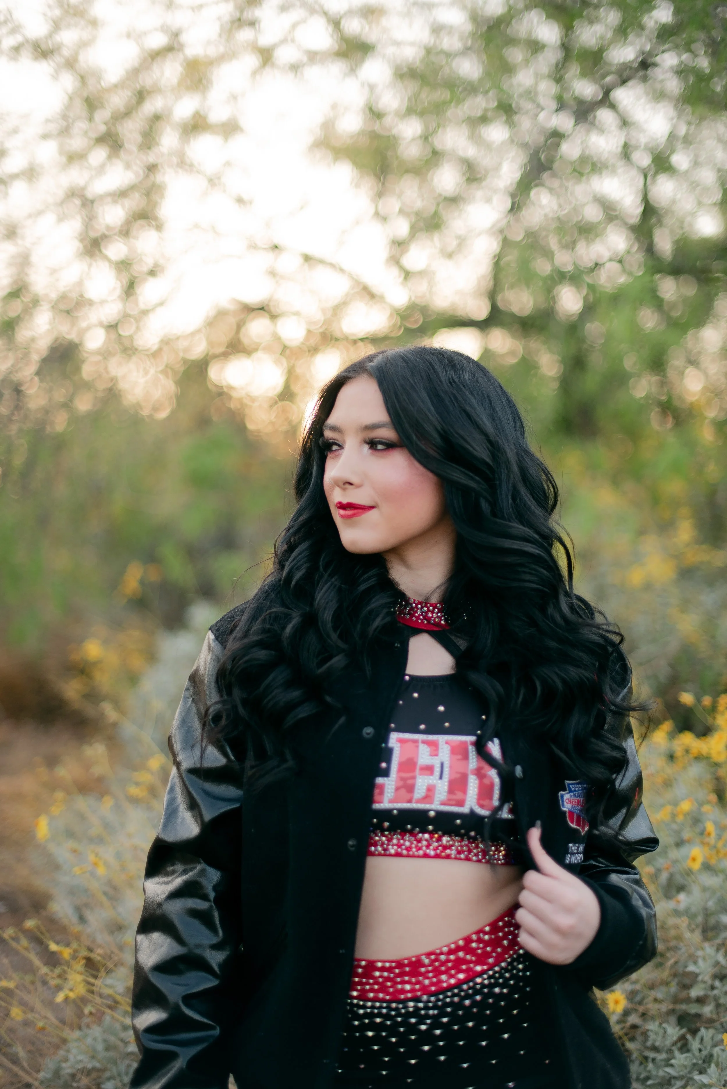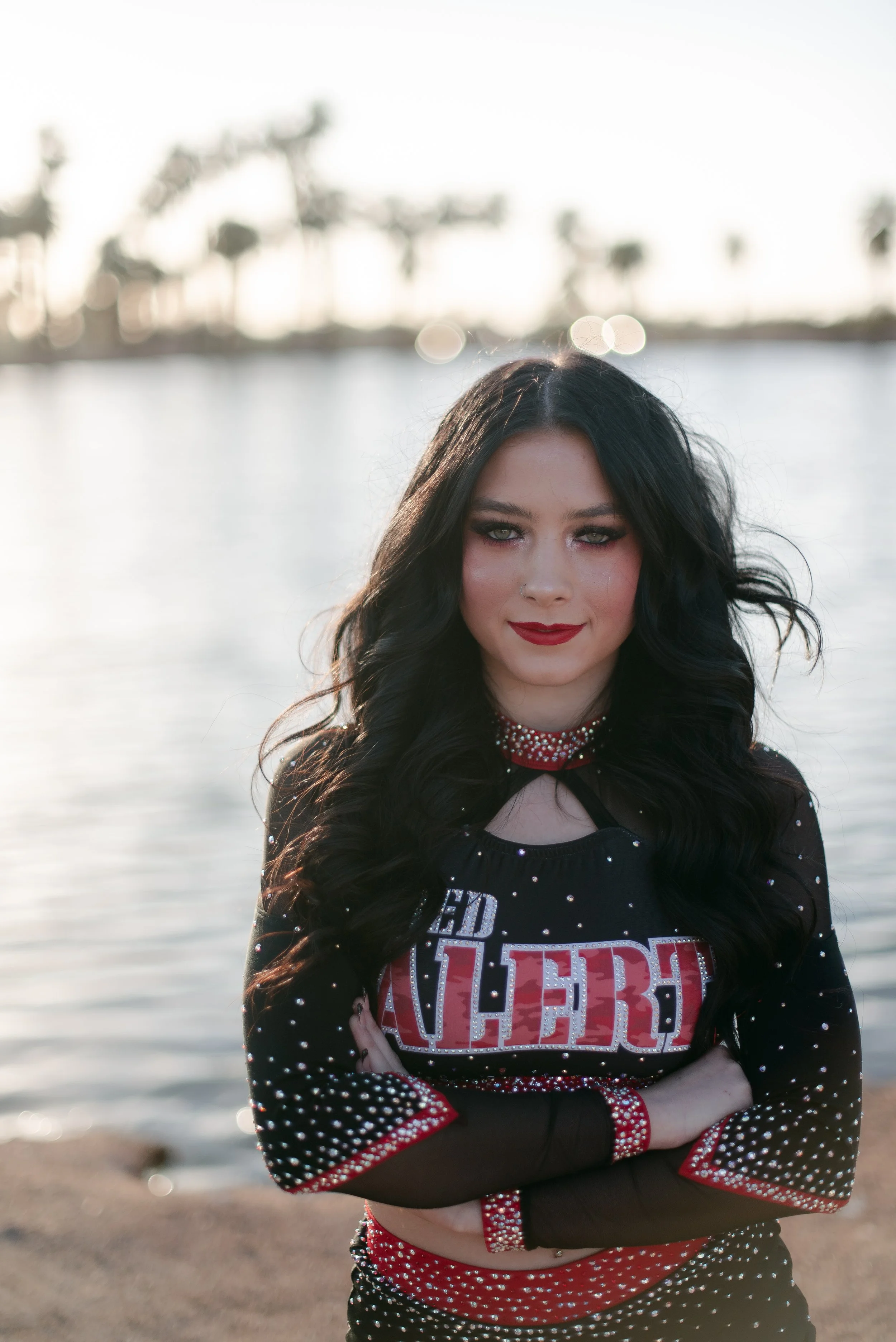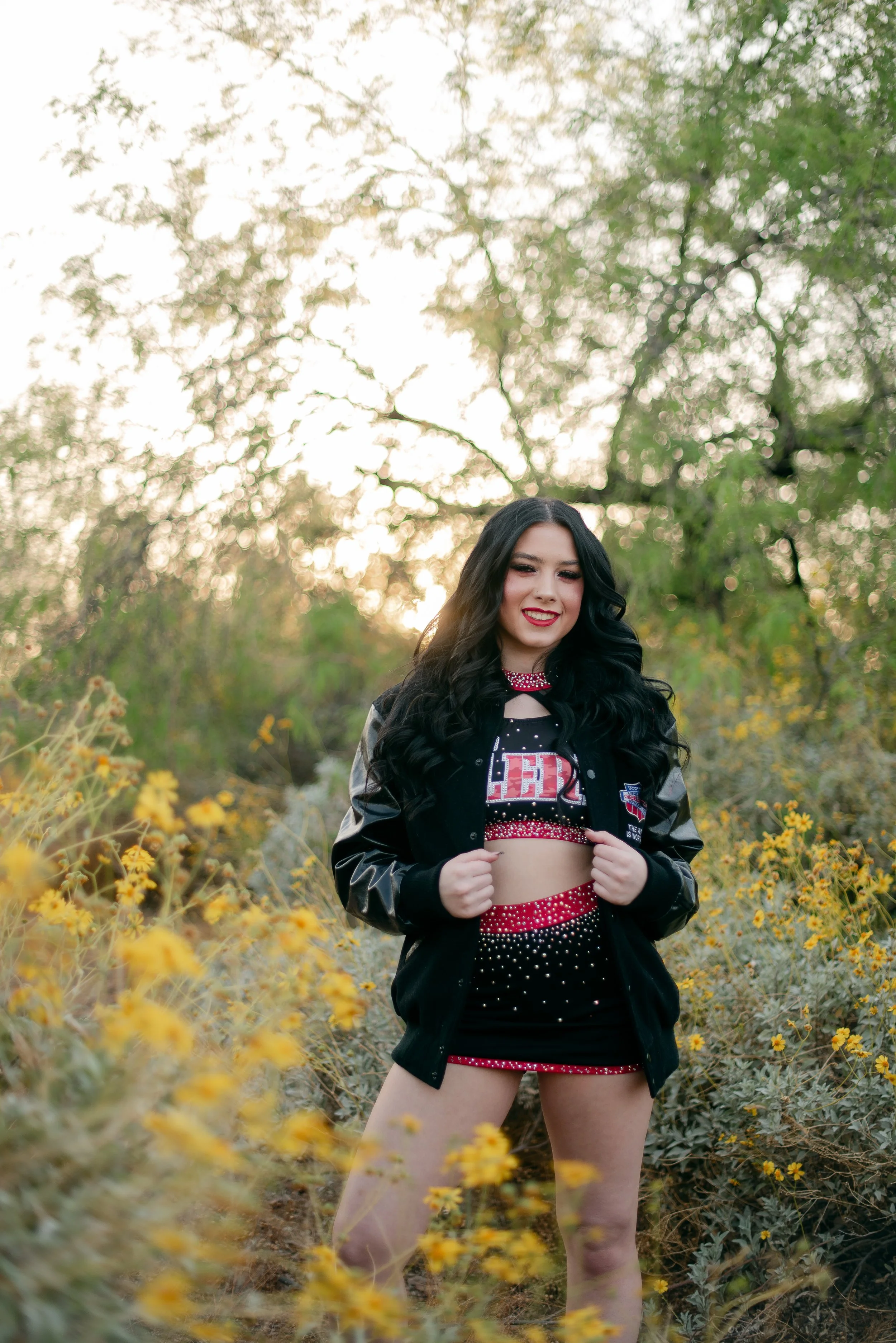 We got to be creative out at Papago Park, which is one of my favorite locations because you can get a mix of desert, water, and greenery. I’m obsessed with the red Woodlands Elite Red Alert uniform against all the desert tones, and her makeup was just perfect. Do not even get me started on all her champion rings, two NCA jackets, and literal NCA trophy.