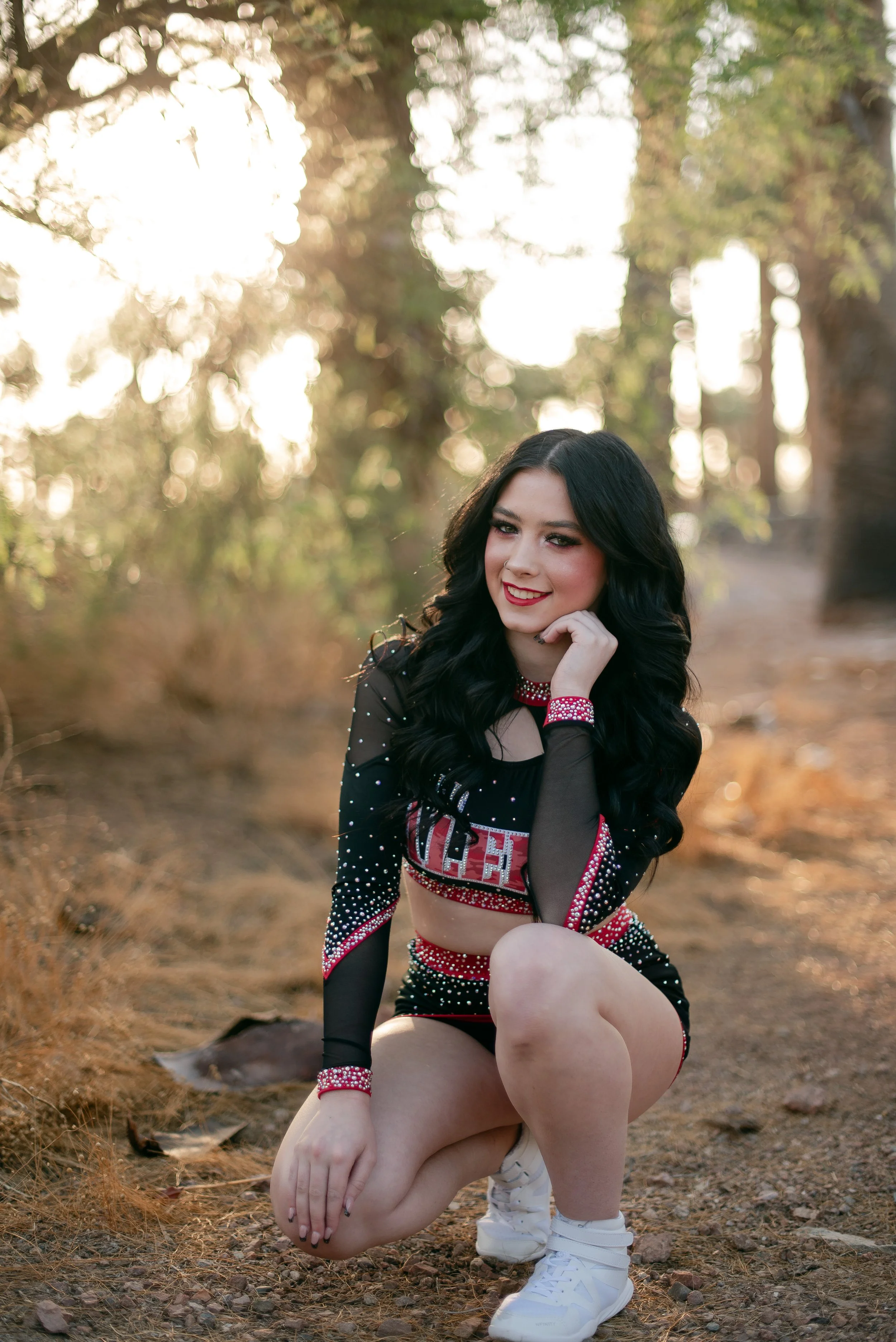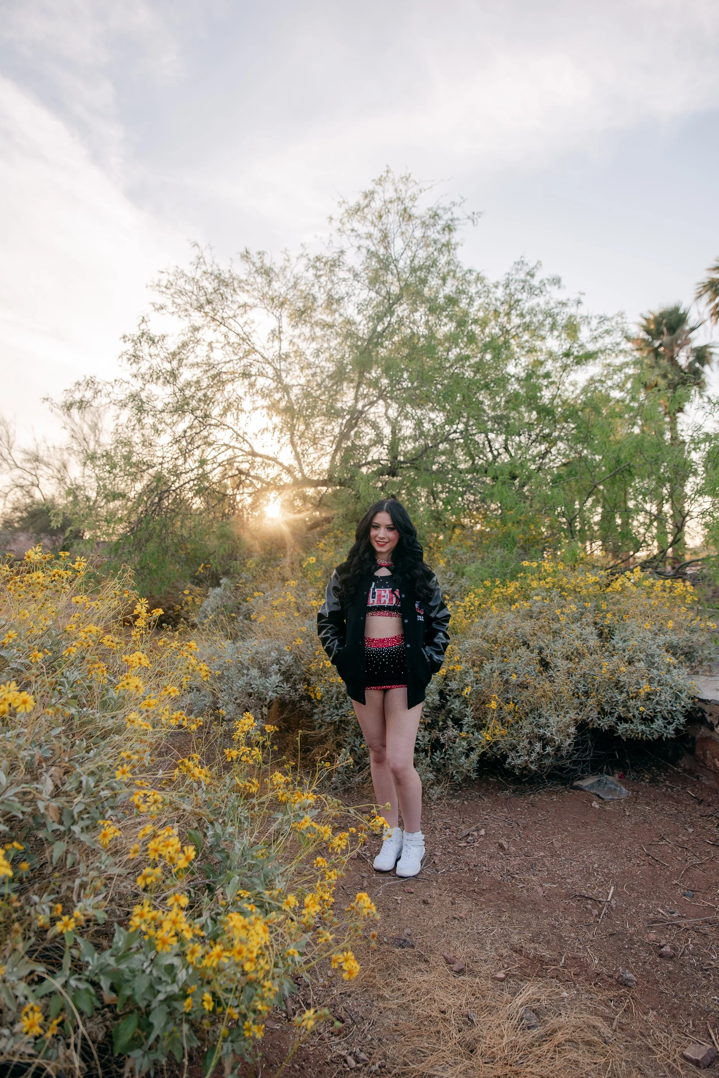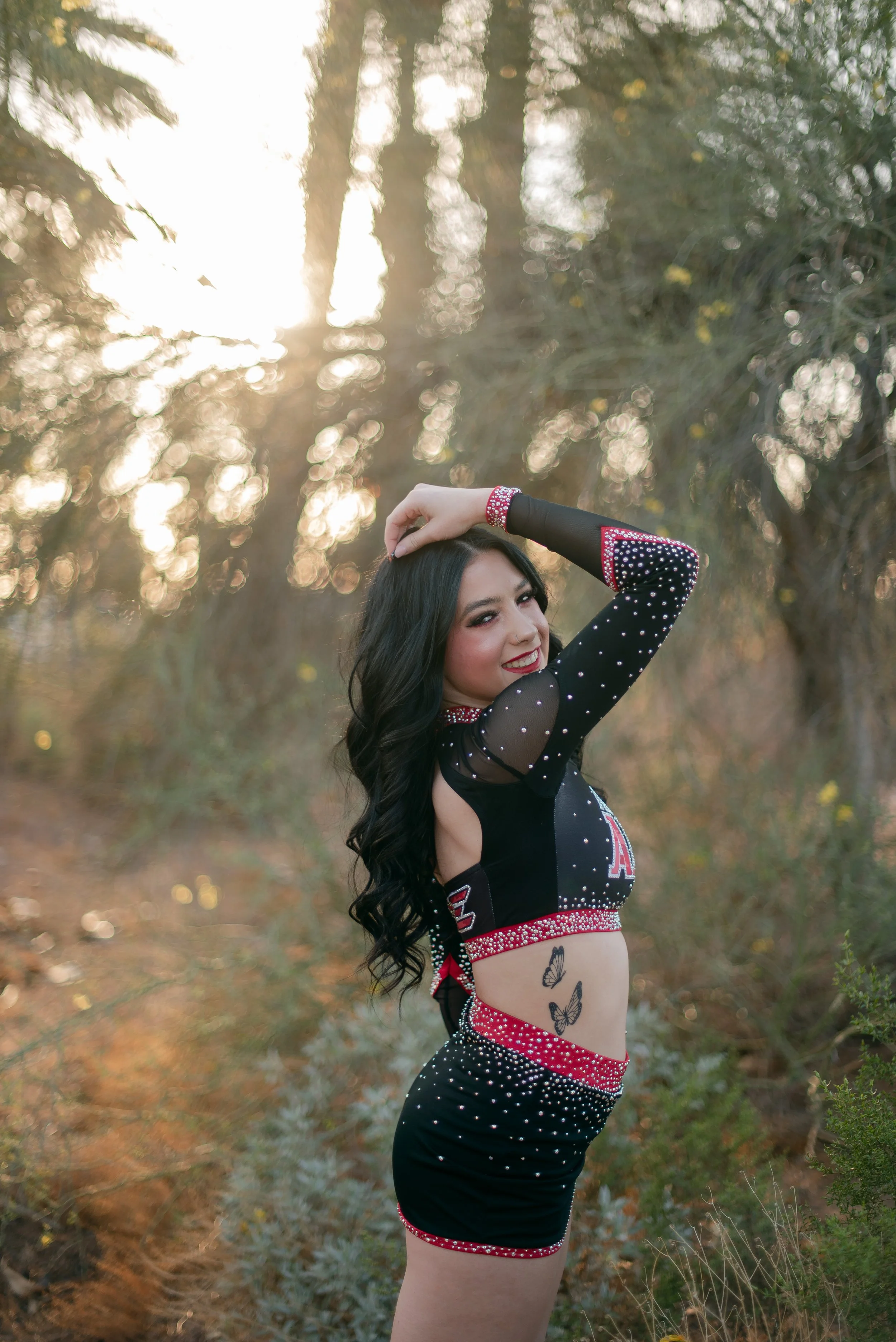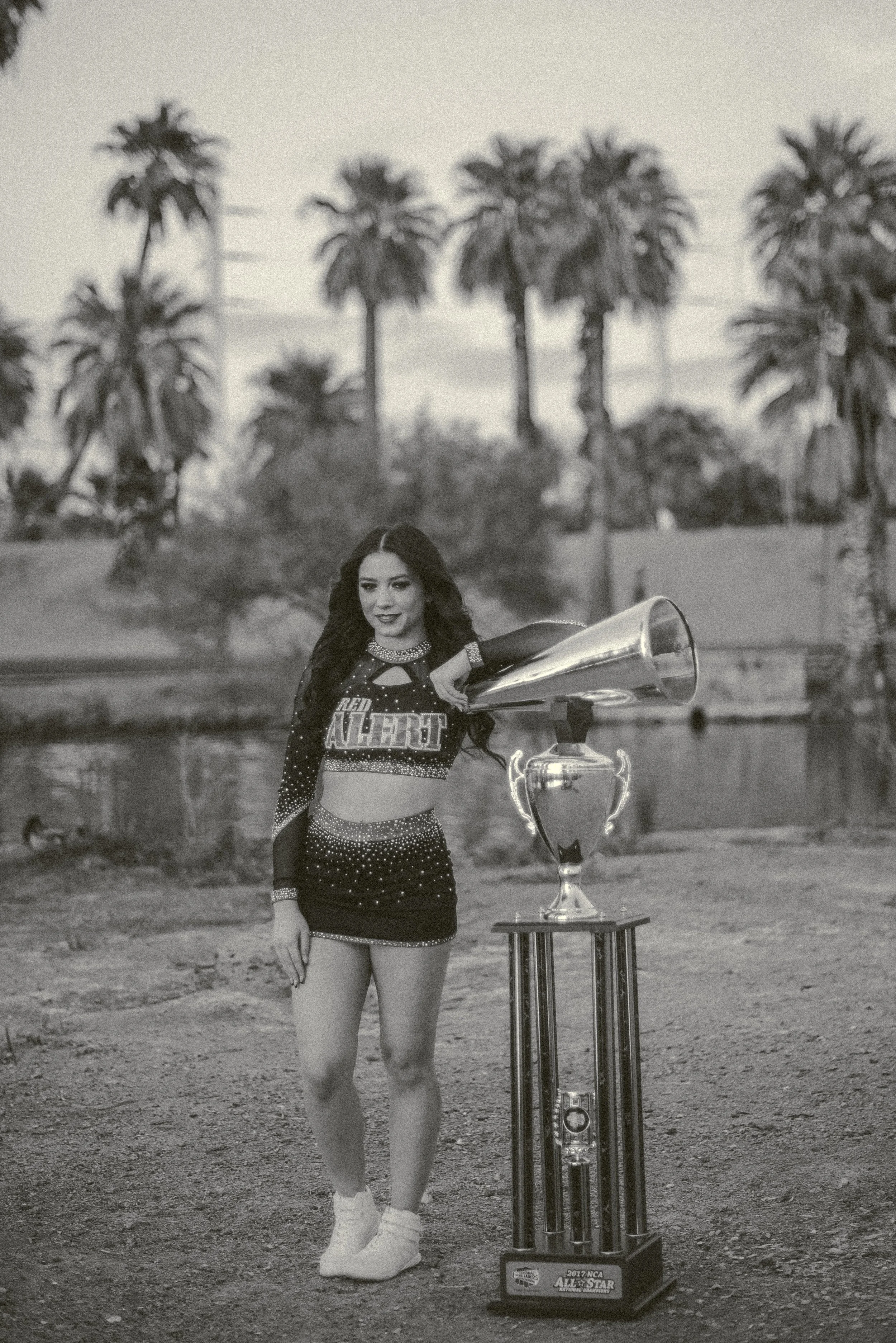 We got to be creative out at Papago Park, which is one of my favorite locations because you can get a mix of desert, water, and greenery. I’m obsessed with the red Woodlands Elite Red Alert uniform against all the desert tones, and her makeup was just perfect. Do not even get me started on all her champion rings, two NCA jackets, and literal NCA trophy.