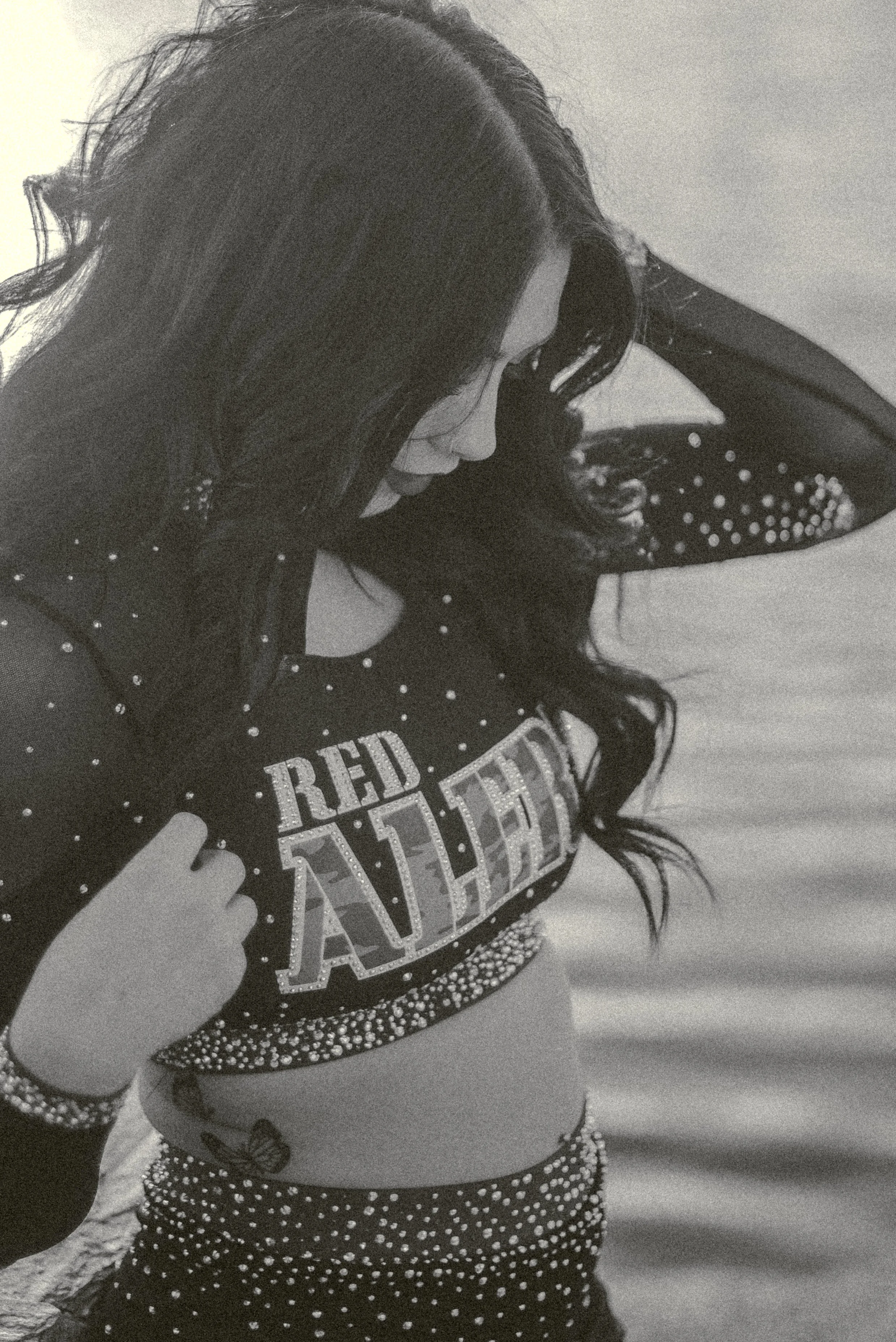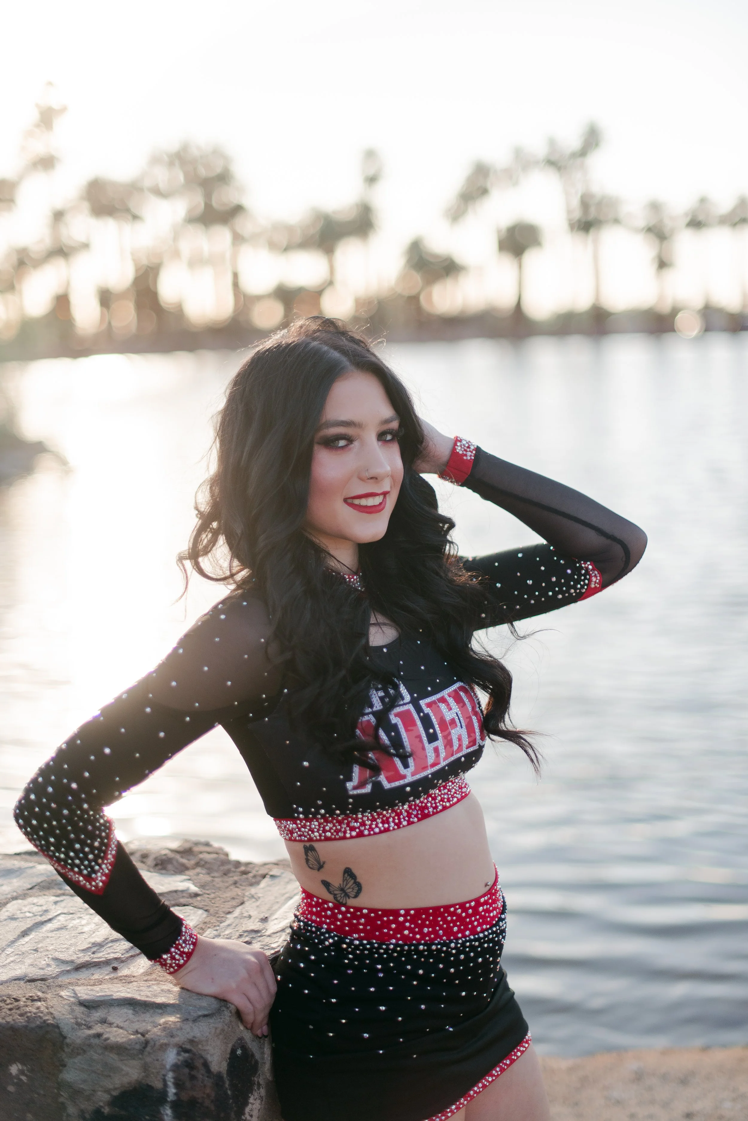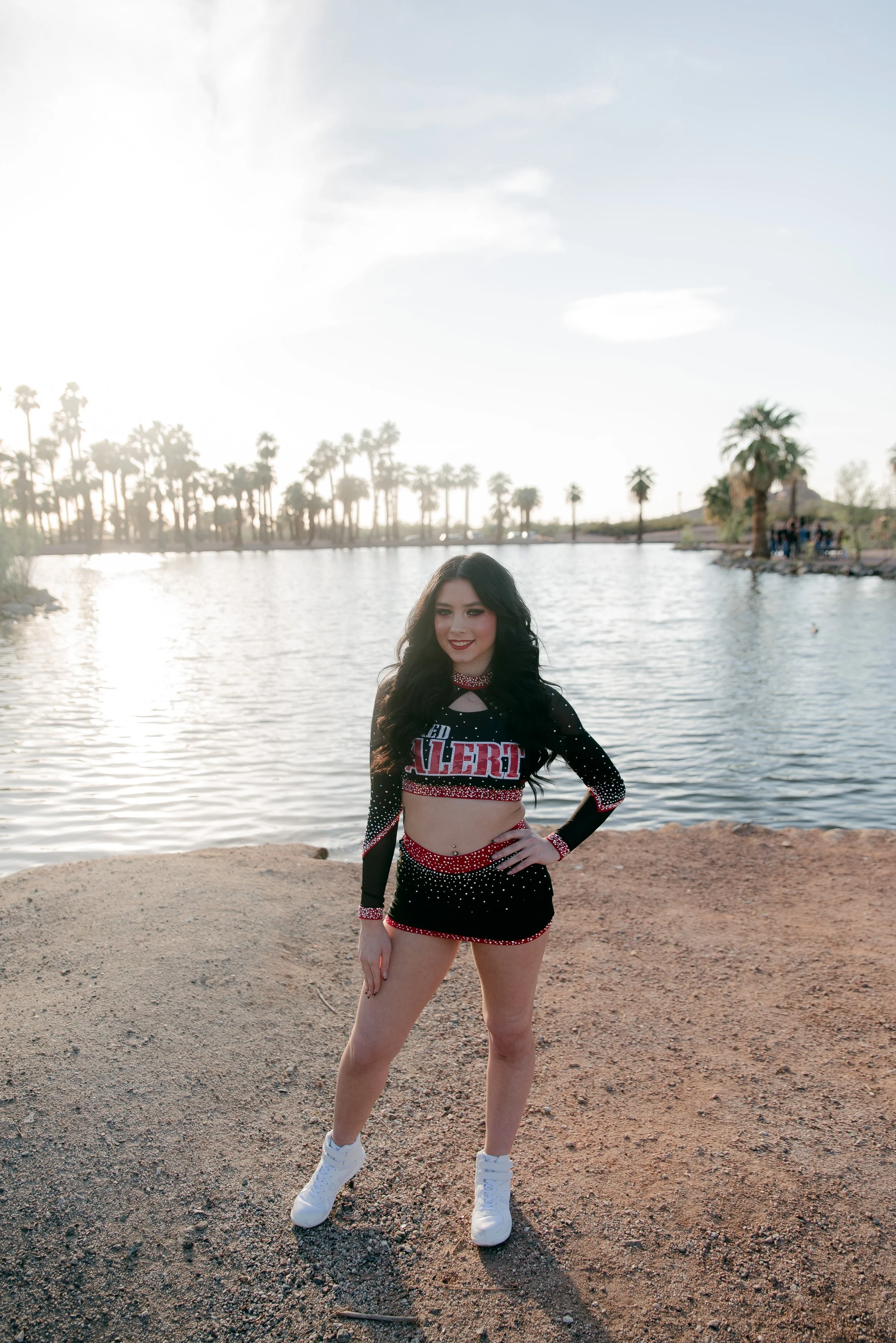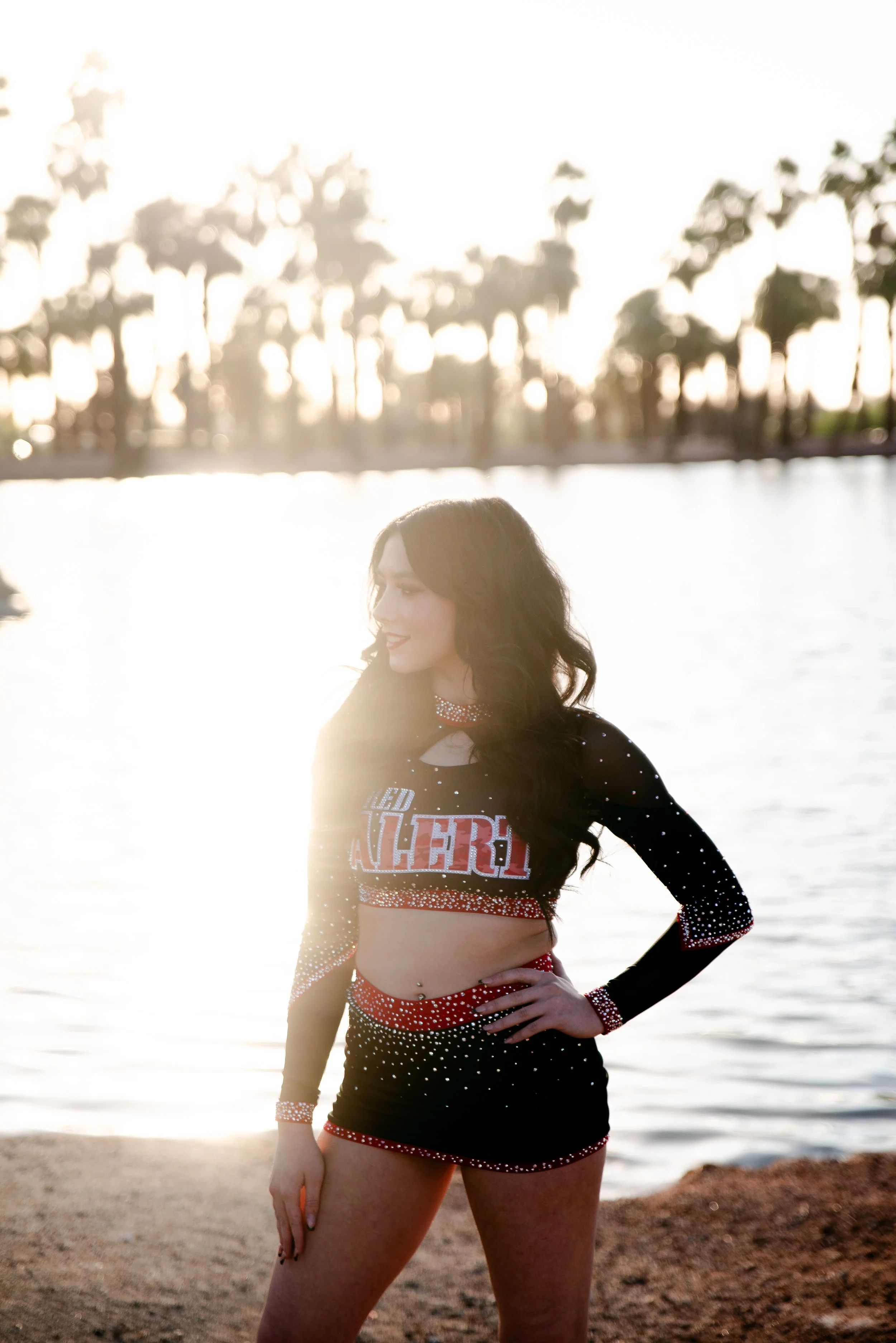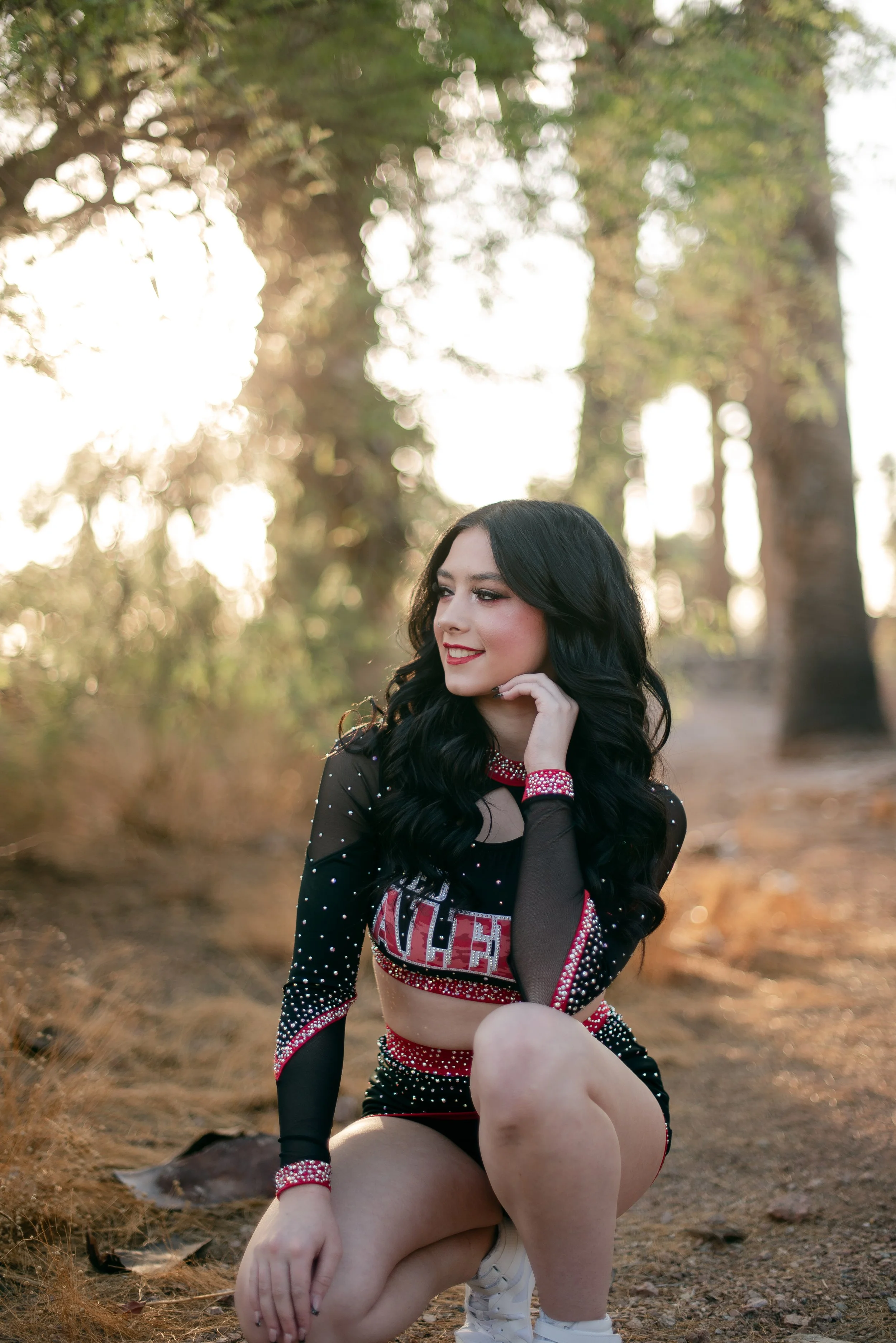 We got to be creative out at Papago Park, which is one of my favorite locations because you can get a mix of desert, water, and greenery. I’m obsessed with the red Woodlands Elite Red Alert uniform against all the desert tones, and her makeup was just perfect. Do not even get me started on all her champion rings, two NCA jackets, and literal NCA trophy.